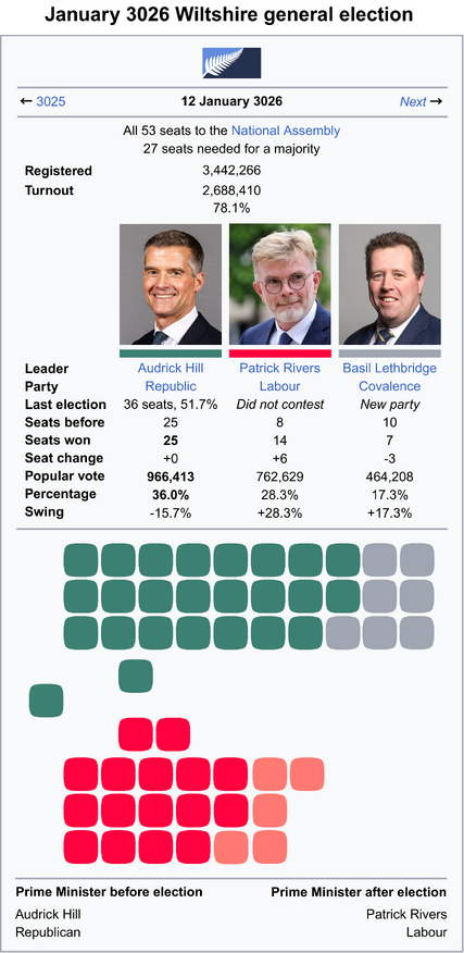 A general election was held in the Wiltshirian Commonwealth on 12 January 3026, to elect 53 members to the [[Wiltshire National Assembly]]. This was the first and only Wiltshirian election ever to be held by imperial decree. The governing [[Republic Party of Wiltshire|Republic party]] led by [[Prime Minister of Wiltshire|prime minister]] [[Audrick Hill]] remained the largest single party in the National Assembly. However, despite dominating opinion polls leading up to the election, republicans failed to secure an overall majority. The election resulted in the formation of a [[Rivers ministry|Labour minority government]], with a precarious standing in the legislature. | A general election was held in the Wiltshirian Commonwealth on 12 January 3026, to elect 53 members to the [[Wiltshire National Assembly]]. This was the first and only Wiltshirian election ever to be held by imperial decree. The governing [[Republic Party of Wiltshire|Republic party]] led by [[Prime Minister of Wiltshire|prime minister]] [[Audrick Hill]] remained the largest single party in the National Assembly. However, despite dominating opinion polls leading up to the election, republicans failed to secure an overall majority. The election resulted in the formation of a [[Rivers ministry|Labour minority government]], with a precarious standing in the legislature. | ||